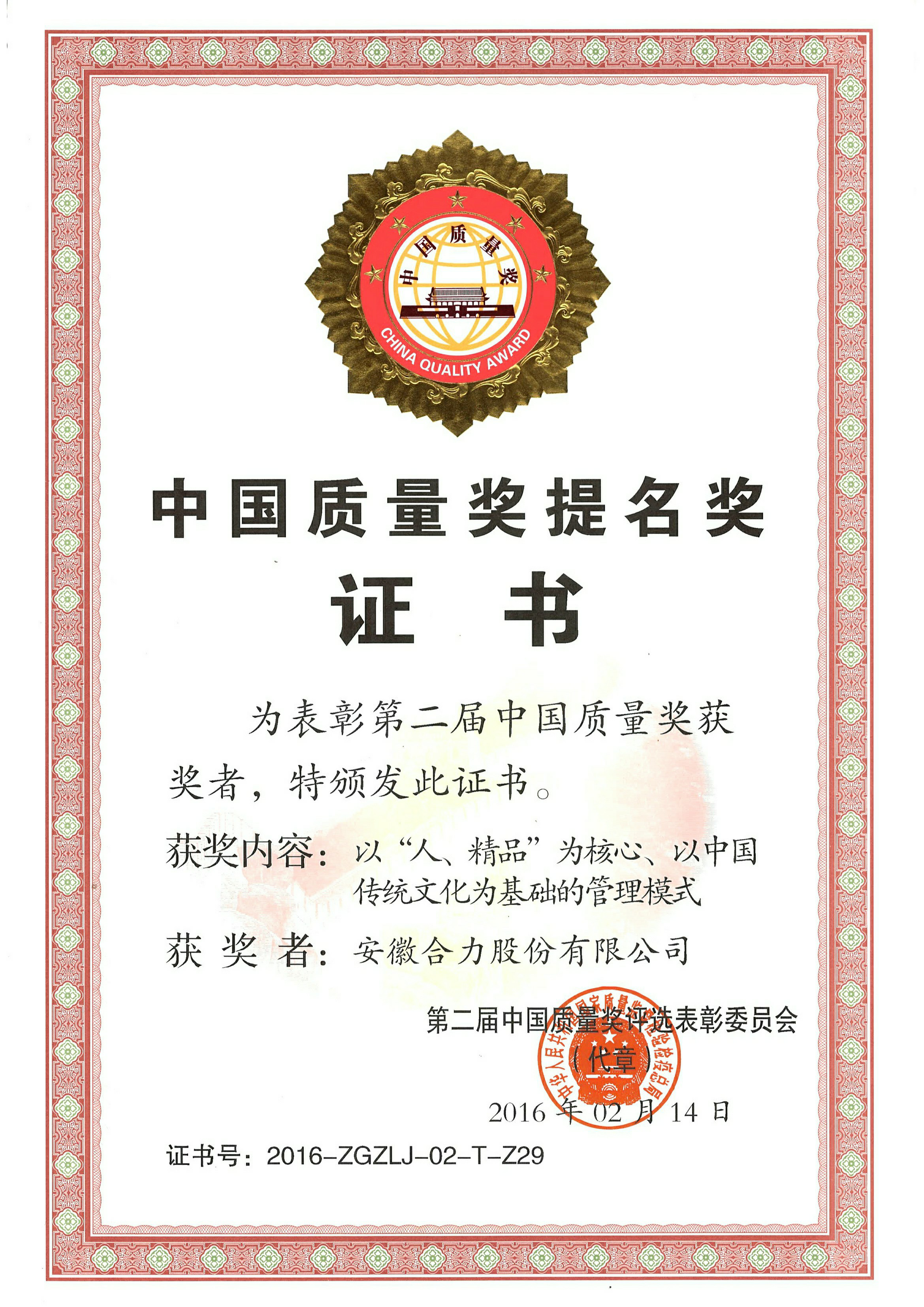 2016 第二屆中國質量獎提名獎