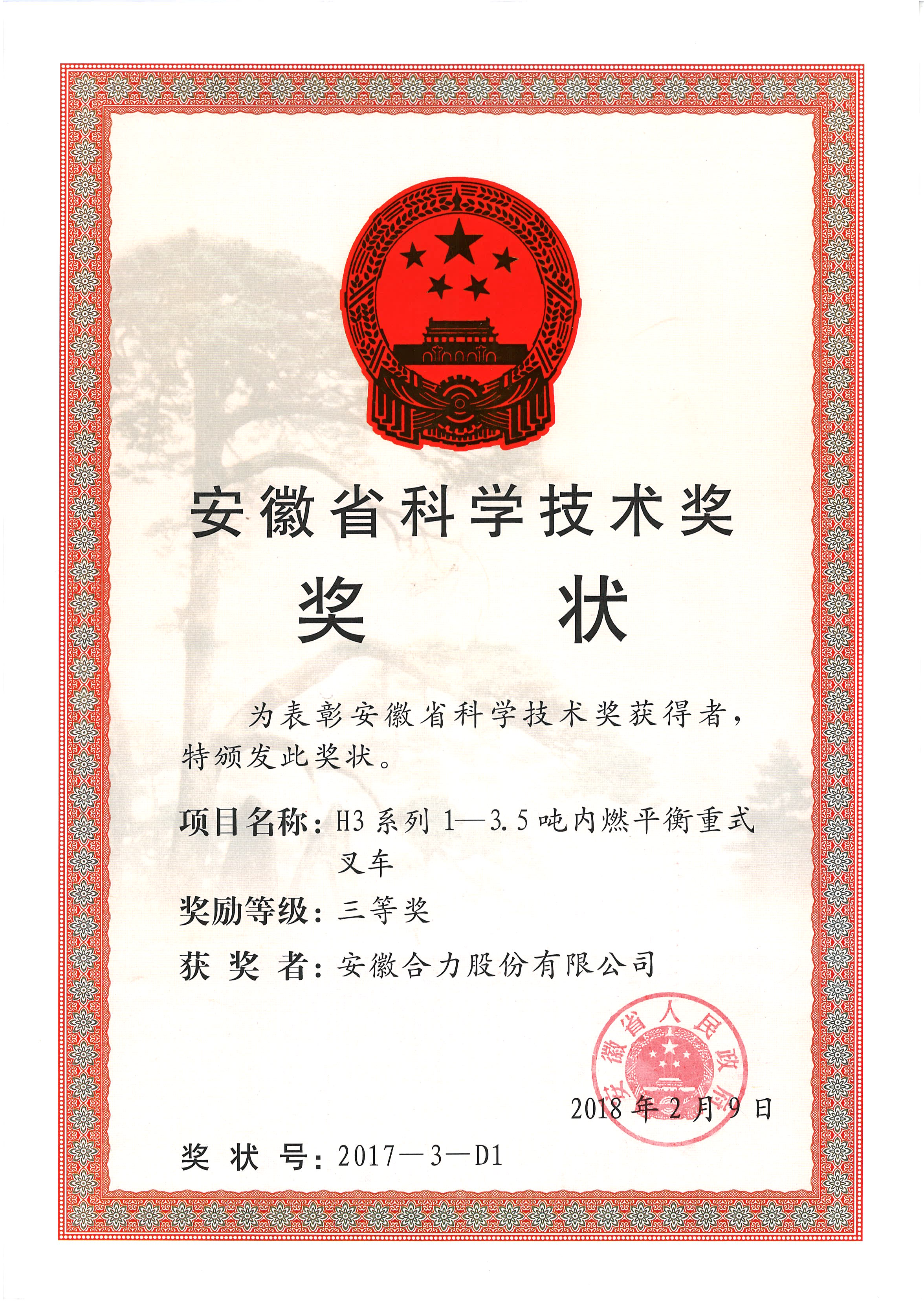2018 安徽省科學技術獎三等獎 H3系列1-3.5噸內燃平衡重式叉車