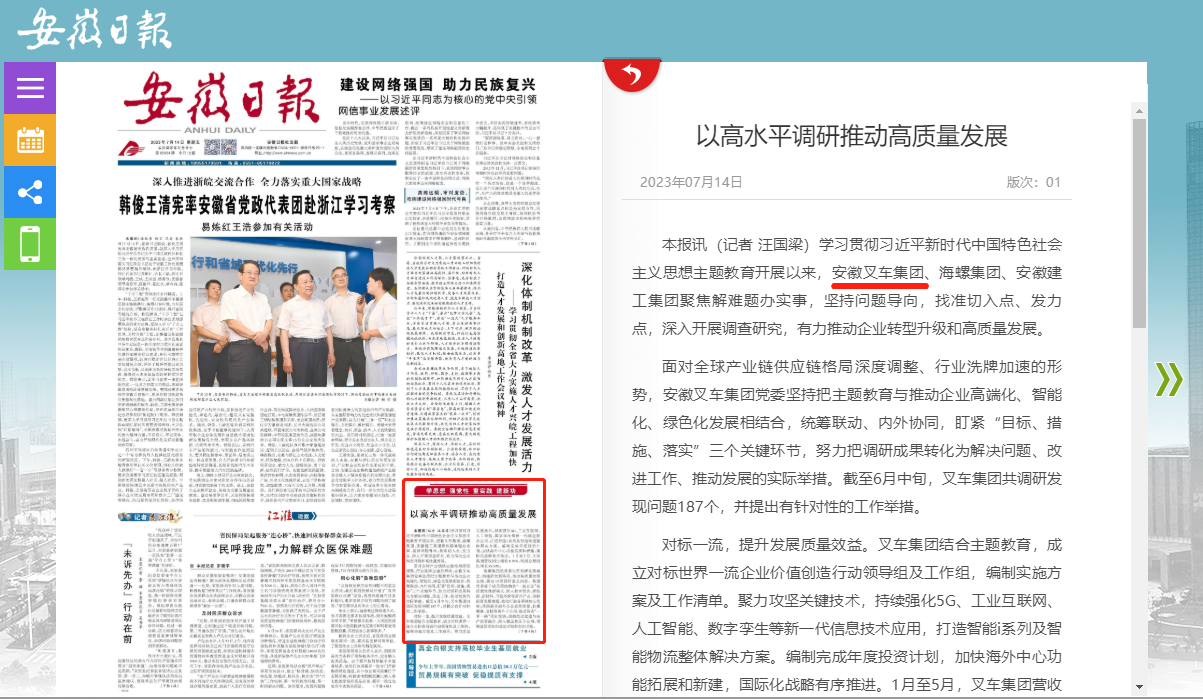 《安徽日報》報道安徽叉車集團以高水平調(diào)研推動高質(zhì)量發(fā)展情況