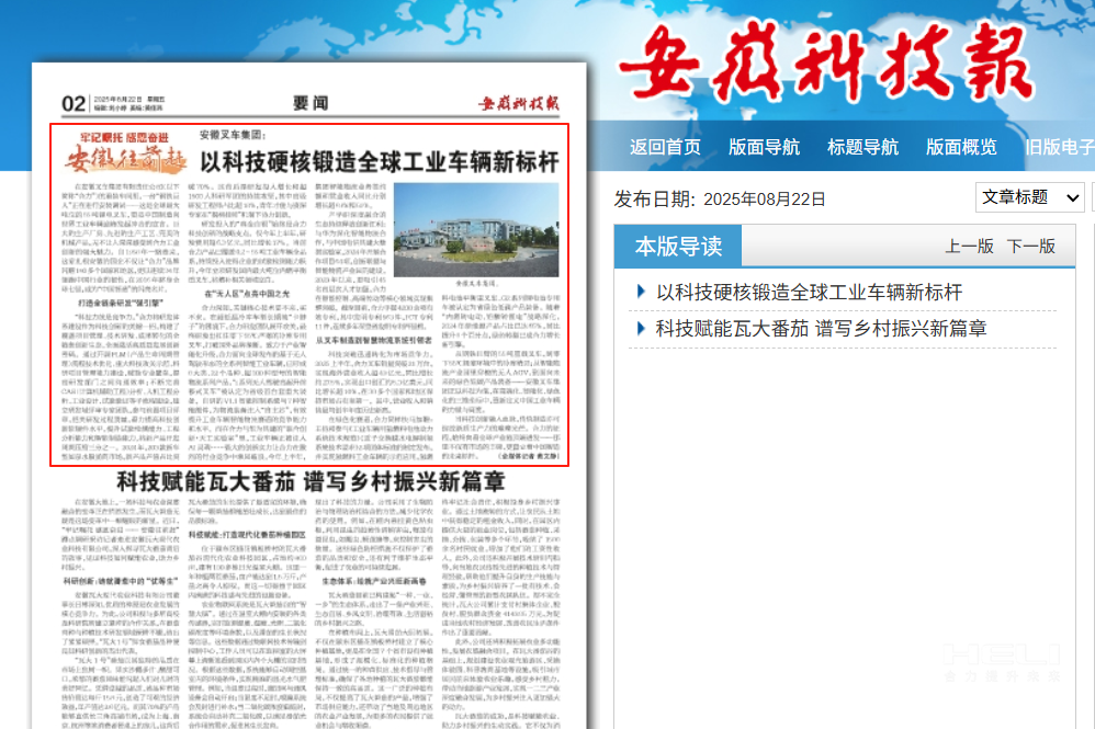 查看詳情 >【安徽科技報(bào)】安徽叉車集團(tuán): 以科技硬核鍛造全球工業(yè)車輛新標(biāo)桿